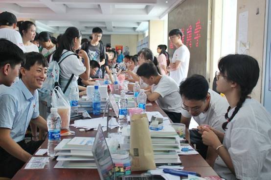 逸夫楼内,2019级各班班主任和助班耐心地为新生们办理着入学注册,同时公司志愿者们也热情引导新生领取一卡通、床上用品以及帮助新生搬运行李,迎新现场工作高效有序。