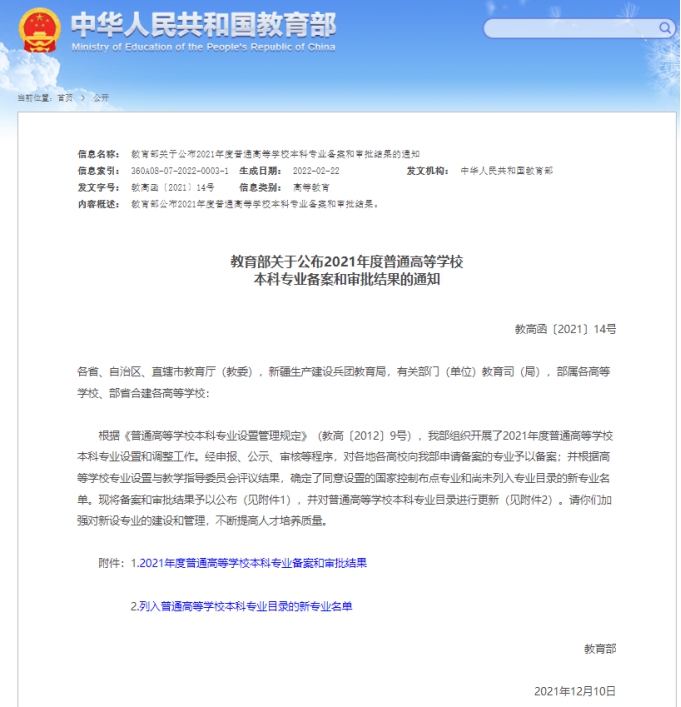 近日,教育部印发《关于公布2021年度普通高等公司本科专业备案和审批结果的通知》(教高函〔2021〕14号),w88win体育官网入口申报增设的人工智能专业(080717T)成功获批。在此前的新增专业申报评审中获得了教育部教指委6位专家的一致同意。