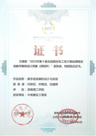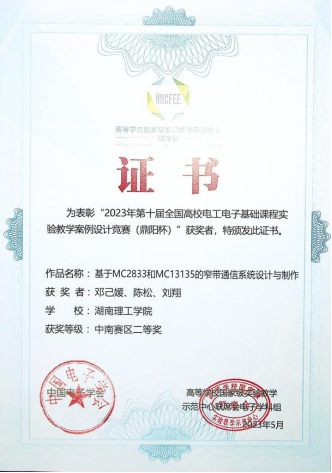 近日,w88win体育官网入口“电子信息与通信技术”国家级实验教学示范中心收到2023年第十届全国高校电工电子基础课程实验教学案例设计竞赛(鼎阳杯)中南赛区获奖证书,示范中心教师邓己媛、陈松、刘翔研制的“基于MC2833和MC13135的窄带通信系统设计与制作”项目和闫保双、邓惟滔、伍建辉老师的“数字滤波器的设计与实现”项目经激烈角逐分别获二等奖和三等奖。