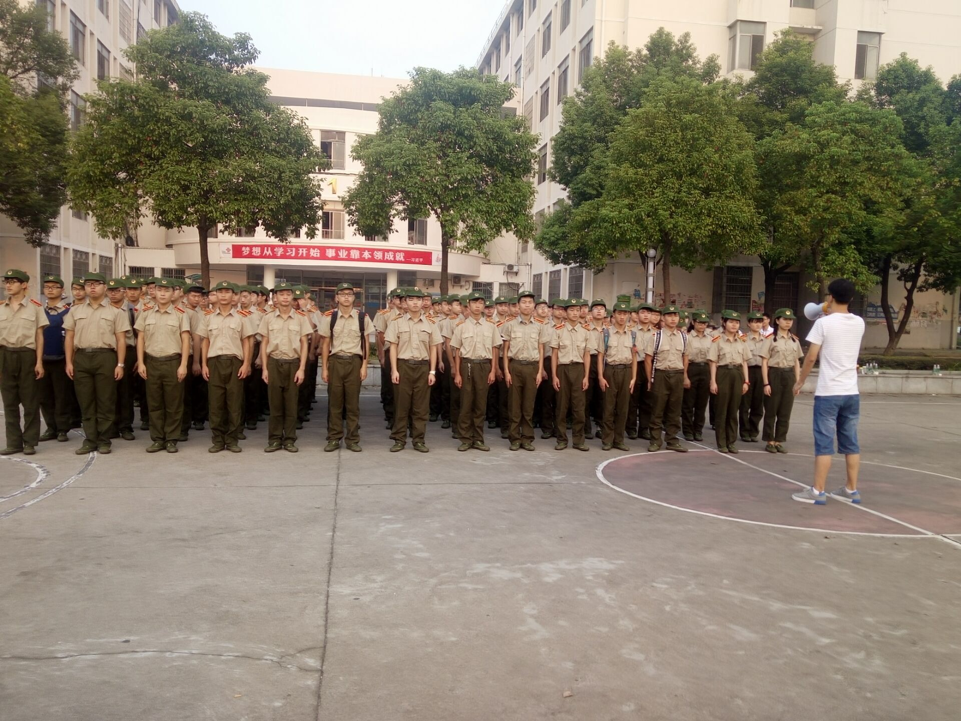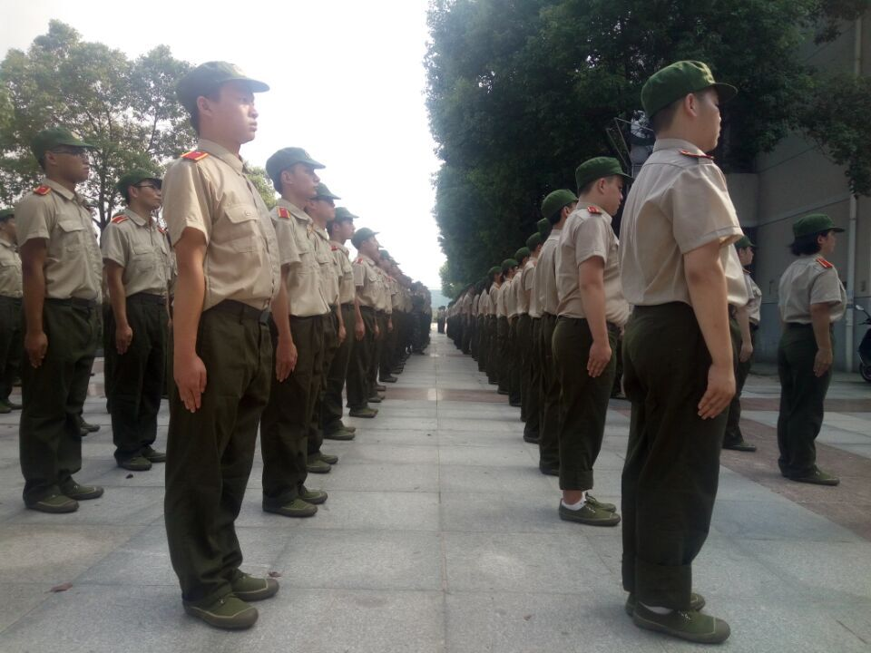 今早六点半,公司每一个军训连队新生都已经到齐。在教官来之前,班级助理们就已经守候在军训场地了,他们手握喇叭喊一声“立正!”整个连队的新手立刻站直了身体,使松散的队伍立马变成了一个整齐的方阵。