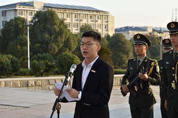伴随着雄壮的国歌,鲜艳的五星红旗在微凉的晨风和磅礴的朝阳中冉冉升起,全体师生面向国旗行注目礼。升旗仪式结束后,2018年湖南省老员工英语演讲比赛一等奖获得者,2016级计科一班杨超同学作为员工代表发言。发言中他围绕“大学,应该怎么过?”这一主题,以一名学长的身份从“学习、社团、朋友”三个方面对新生们提出建议。他讲到:学习上,要学自主、主动学习;社团里,要根据兴趣爱好,合理地选择社团;朋友交际中,要保持乐观积极的态度接纳每一个人。最后,他以“选择不同,投入不同,结果自然会不同”来鼓励同学做好大学规划,努力学习,做自己感兴趣并且有意义的事情,收获充实而又无悔的大学。