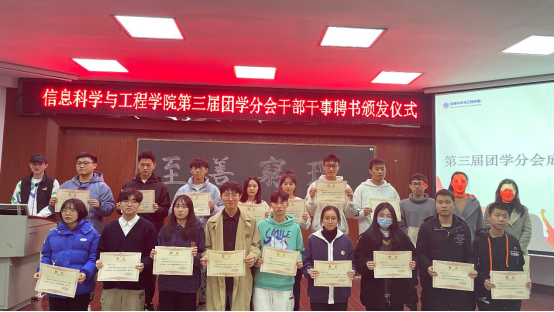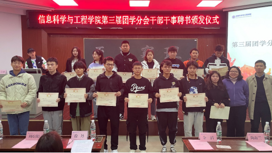 11月23日12:20,信息学院在六栋学术报告厅举行第三届团学干部干事聘书颁发仪式。公司党委副书记徐丹、学工办全体老师出席,第三届团学全体成员参加。仪式由院团委书记王勤主持。