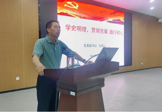 张国云围绕“学史明理,贯彻党章,践行初心”带领全体与会人员学习了《中国共产党章程》,从党章的发展历程和主要内容两个方面重点展开论述。他结合时事、引经据典、立足现实,通过结合历史背景具体史实,向同学们梳理分析党章的发展历史和演进历程。他讲到,党章经过多次修订完善,在党的十九大上通过了《中国共产党章程(修正案)》决议,习近平新时代中国特色社会主义思想写入党章。《党章》作为党内根本大法,全体党员都要自觉学习党章、遵守党章、贯彻党章、维护党章。