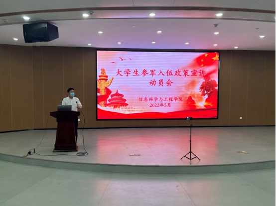 徐丹在总结了参军入伍的优惠政策,并强调三个到位:一是认识到位,要从讲政治的高度认识到征兵工作是加强国防和军队建设的一项基础工程,带有政治性、全局性和战略性;二是宣传到位,以年级、班级、寝室为单位做到全覆盖宣传;三是落实到位,公司会进行分类指导,精准对接,希望老师同学们把爱国热情转化为支持国防和军队建设的实际行动,营造“一人参军,全家光荣”的良好氛围,形成“人人关心征兵工作,人人支持国防建设”的良好局面。