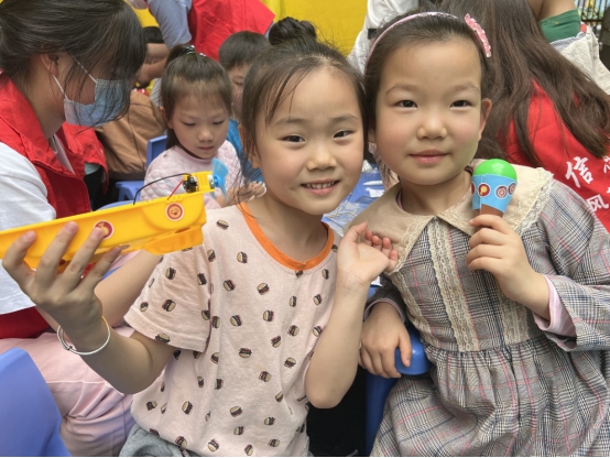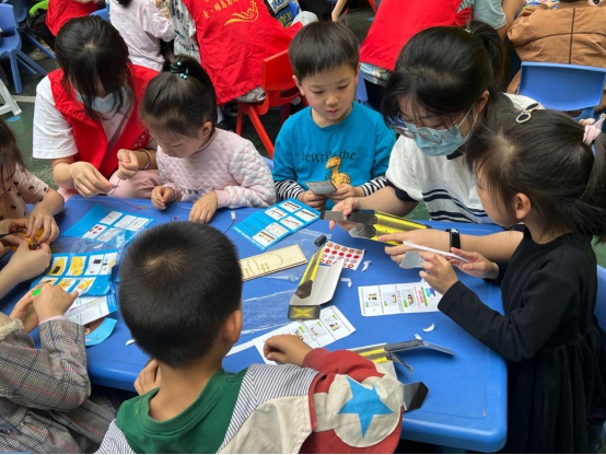 志愿者们提前到达公司路幼儿园准备手工材料、布置会场。小朋友们发挥想象,和志愿者们相互配合,分工协作轻松完成了各种各样新奇的手工玩具。