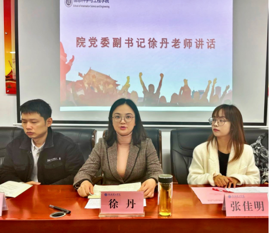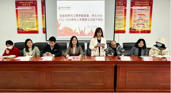 11月23日12:30,信息学院于17503召开第五次团学例议。公司党委副书记徐丹,团委副书记张佳明,辅导员王学鹏、李亦波、陶海兰、徐壮、王艳芬、刘照馨出席,团学全体成员参加。张佳明主持本次会议。
