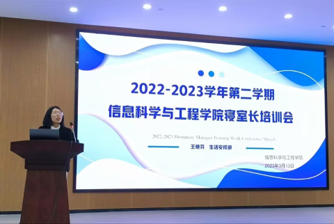 王宇杰、丁徐佳和李思良从寝室卫生、寝室安全等方面进行详解介绍,要求寝室长加强对寝室成员相关知识的讲解。希望各位寝室长发挥带头模范作用,遵守寝室规则。优秀寝室长唐强和陈彩晴从寝室安全卫生、生活氛围、学习成果等方面分享了寝室精神面貌,激励寝室长们做一个有责任心、有爱心的寝室长。