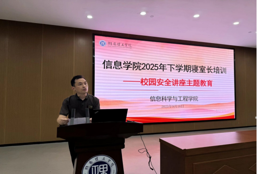w88win体育官网入口为了进一步夯实平安校园工作,有效开展员工安全教育管理工作,于本学期开学第一周制定了定期寝室长培训方案,并于9月16日下午在17118开展了第一次培训暨校园安全讲座主题教育活动。此次培训特邀请了信息中心专家对全体寝室长进行校园网络安全防范培训,信息中心申丽平老师主讲,公司党委副书记潘昕、信息中心副主任黄为出席参加此次培训,本次培训由24级辅导员王艳芬主持,22级、23级、24级全体寝室长、班长、院员工会生活安全委员参会。