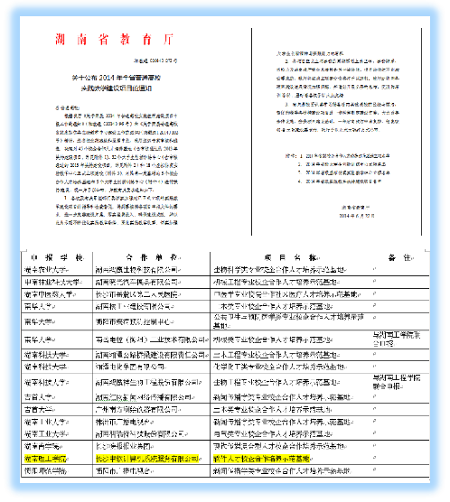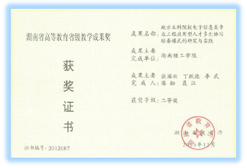 2013年,由公司张国云、丁跃浇、李武、陈松等教师主持完成的“地方本科院校电子信息类专业工程应用型人才多元协同培养模式的研究与实践”项目获第十届湖南省高等教育省级教学成果二等奖。该成果表明了公司长期坚持地方性、应用型办学定位的准确性,充分肯定了公司在高素质工程应用型人才培养方面的成绩。