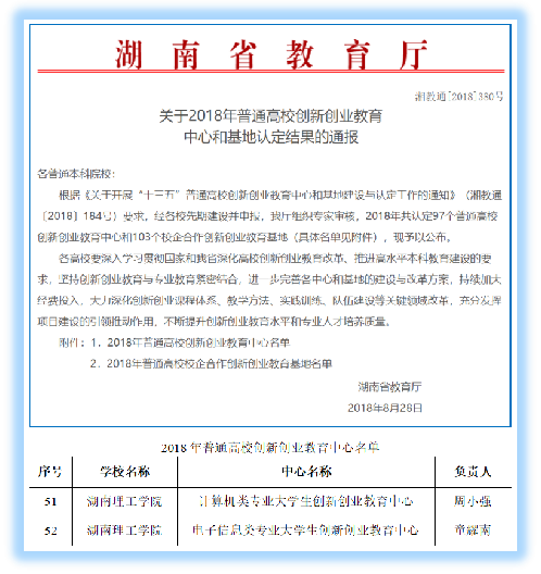 2019年9月23日,省教育厅公布《关于公布第十二届湖南省高等公司产品成果奖获奖项目的通知》(湘教通〔2019〕294号),公司李武教授主持完成的“整合平台资源,强化实践育人,培养高素质电子信息类工程创新人才”荣获公司产品成果三等奖,公司张国云、彭鑫参与完成的“地方高校应用型人才‘一体两轮三核四优’产教融合协同培养模式的创新与实践”荣获一等奖。